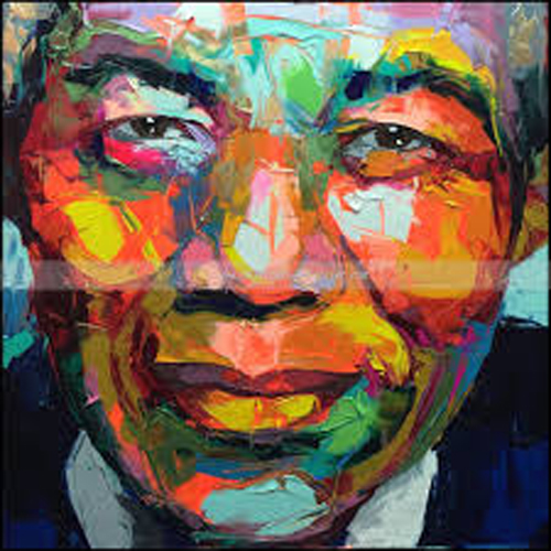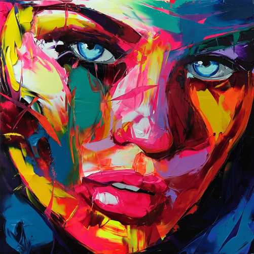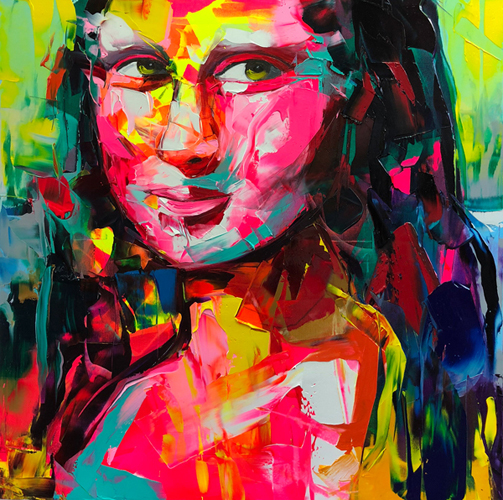 Nielly has brought back portrait art with her palette brush technique. Watching her work is stunning. She sketches with the palette knife as if it were an erasable pencil, not wedge laden with thick paint. Over the barest outline, she layers diverse colors and integrates them with swift, decisive gestures. In all of her portraits, blends of bold colors streak across the canvas to create a lively and erotic energy, as faces emerge from her stark, solid backgrounds. Nielly's subjects often have a burning gaze and facial expressions that suggest strong and salacious desires. The powerful, fixed stare of her subjects is captivating and viewers cannot help but wonder if there are hidden intentions behind the eyes of these compelling figures.