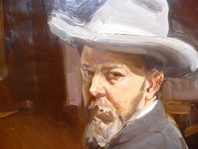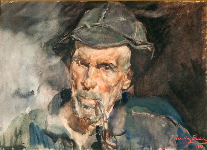 For studio portraits, his palette included black, burnt umber, raw umber, rose madder, burnt sienna, raw sienna, yellow ochre, Naples yellow, vermilion and cobalt blue. Occasionally he would add orange, pink or purple, but he usually emphasized strong tonal contrasts over ambitious colour effects. In the studio Sorolla would sometimes use a palette the size of a grand piano lid and 3 foot long brushes to allow him to stand back from his painting.